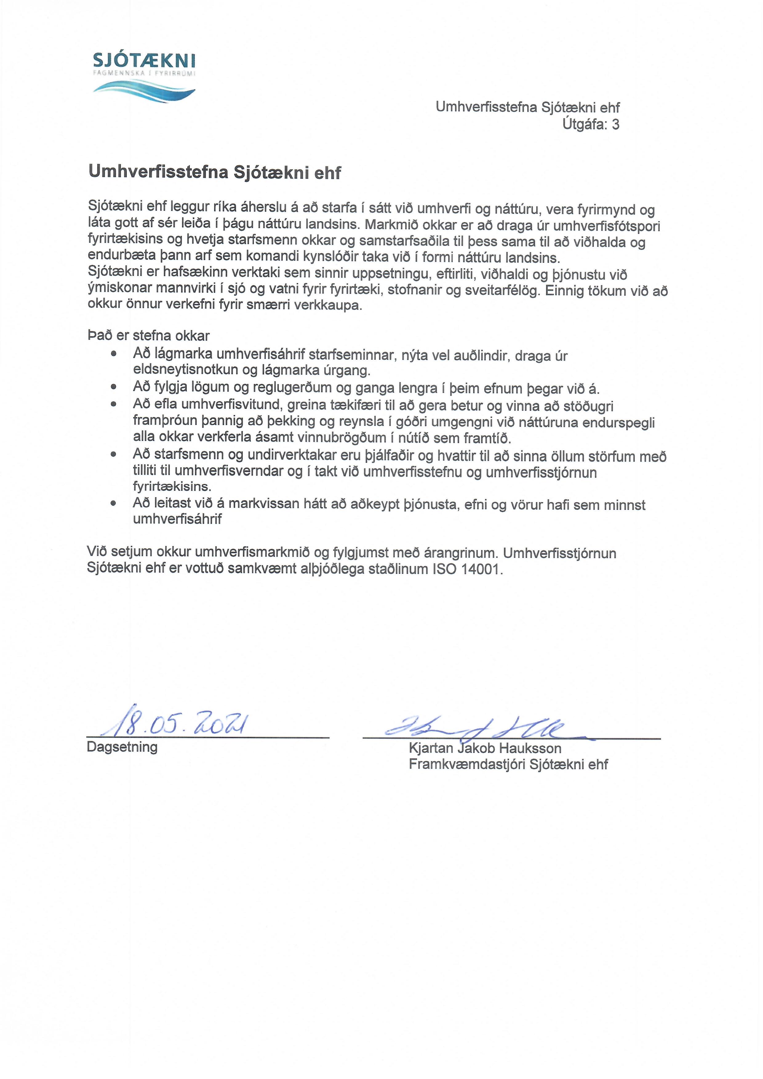 Umhverfisstefna Sjótækni ehf er samþykkt 18.05.2021 og staðfest með vottun DNV 17.06.2021